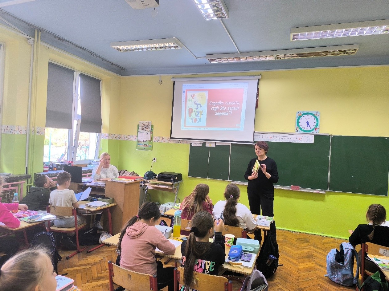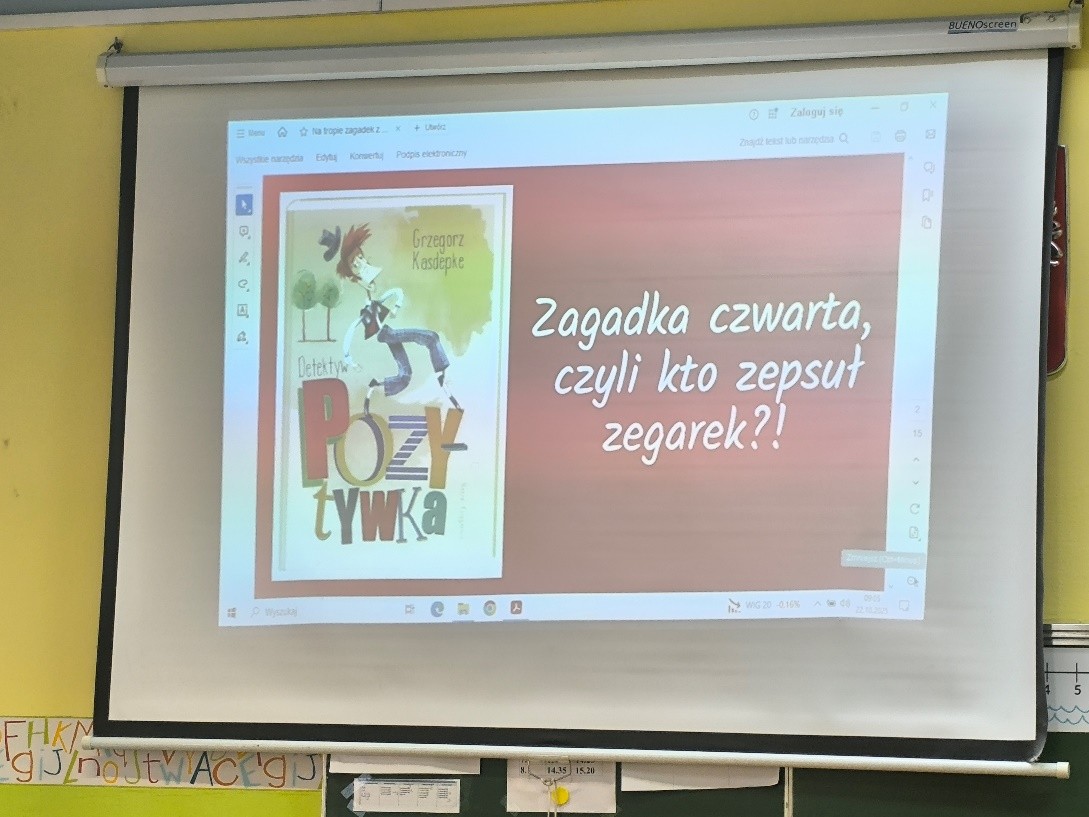Książka pt.: „Detektyw Pozytywka”, Grzegorza Kasdepke, jest fantastyczną bazą wyjściową do ciekawych zajęć z młodymi czytelnikami. 22.10.2025 r. w klasie III a, odbyło się kolejne spotkanie z pracownikami Biblioteki Pedagogicznej w Katowicach filia w Sosnowcu z cyklu: „Ciekawe pomysły czytelnicze”. Uczniowie podczas zajęć dowiedzieli się o tajnikach pracy detektywa. Dzieci poznały nowe słowa – „genealogia” i wykonywały podczas spotkania drzewo genealogiczne swojej rodziny.